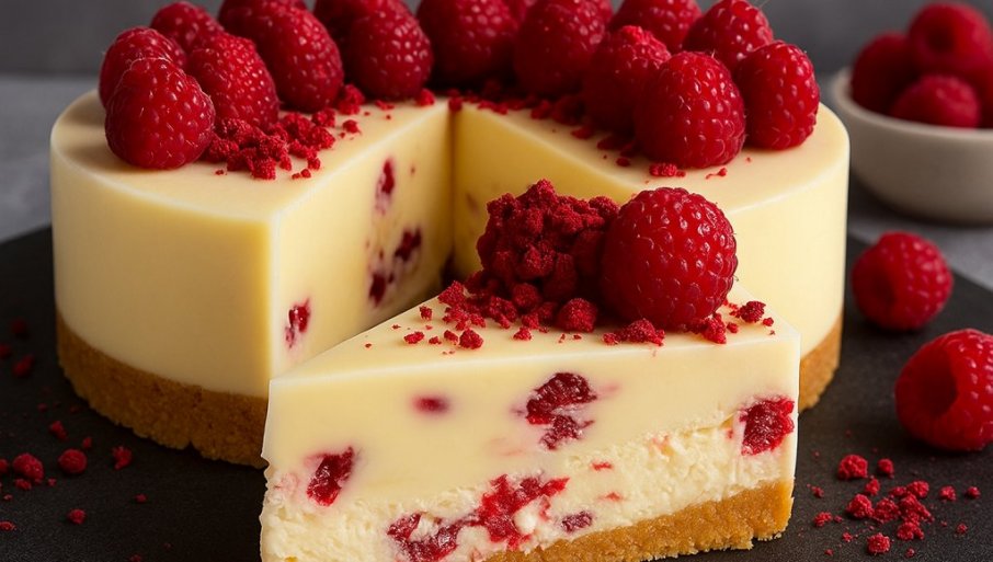 Ovaj čizkejk predstavlja pravi užitak za sva čula, sa svojom kremastom teksturom i nežnim ukusima. Njegova osnova se sastoji od puter biskvitnog podloga, dok je fil sastavljen od svežeg sira ili maskarponea, bele čokolade, pavlake i malina. Ovaj slatkiš je savršena kombinacija ukusa i tekstura, koja se završava sjajnim prelivom od bele čokolade.