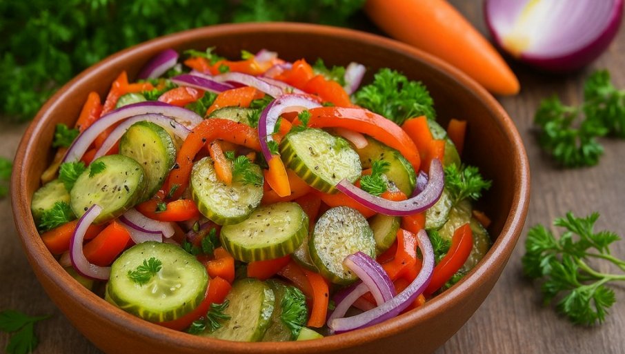 Kombinacija povrća u ovoj salati donosi osvežavajući ukus idealan za razne prilike. Krastavci, paprika, šargarepa i crveni luk čine savršen spoj koji će zadovoljiti i najizbirljivije nepce. Ova salata se može poslužiti kao prilog uz roštilj ili pečenje, ili jednostavno kao lagana užina tokom dana. U nastavku su predstavljeni sastojci i postupak pripreme koji će vam pomoći da uživate u ovom zdravom obroku.